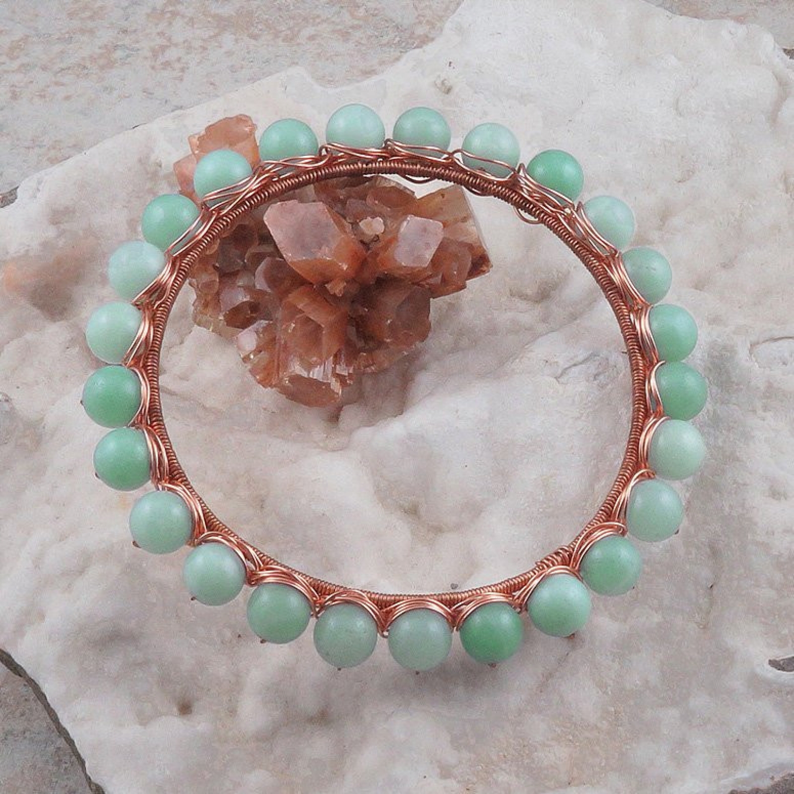 This beautiful bangle bracelet is sure to become a favorite accessory. It features 8mm amazonite beads wire wrapped with 24 gauge copper wire. The inside measurement is just over 7 3/4 inches. The diameter is 2 1/2 inches.
