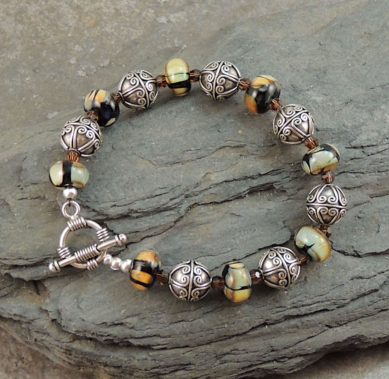 This gorgeous bracelet is sure to become a favorite accessory. It features beautiful artisan lampwork beads, 11mm Bali Silver beads and 4mm Swarovski crystal accents. The bracelet measures approximately 7 inches on the wrist (interior measurement) and fastens with a Bali Silver toggle clasp.