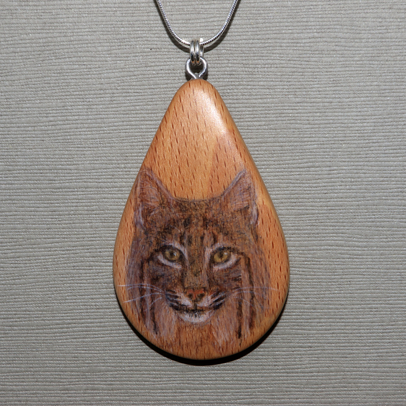 This beautiful pendant features a bobcat hand drawn on beechnut wood. It measures 1.5 x 2.5 inches and hangs from an 18 inch sterling silver snake chain.