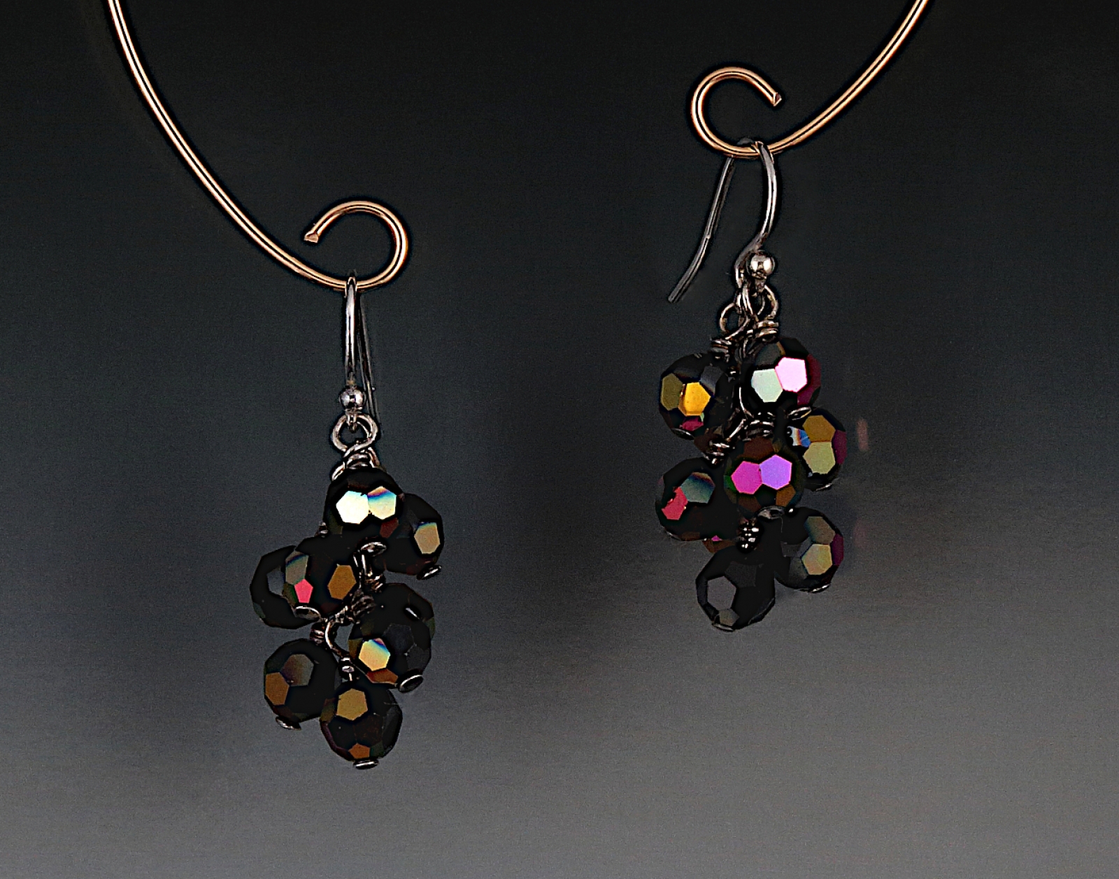 These delightful earrings are sure to become a favorite accessory. They feature clusters of 6mm high quality European crystals wire wrapped to tiny sterling silver chains. They hang 1 inch below the sterling ear wires.