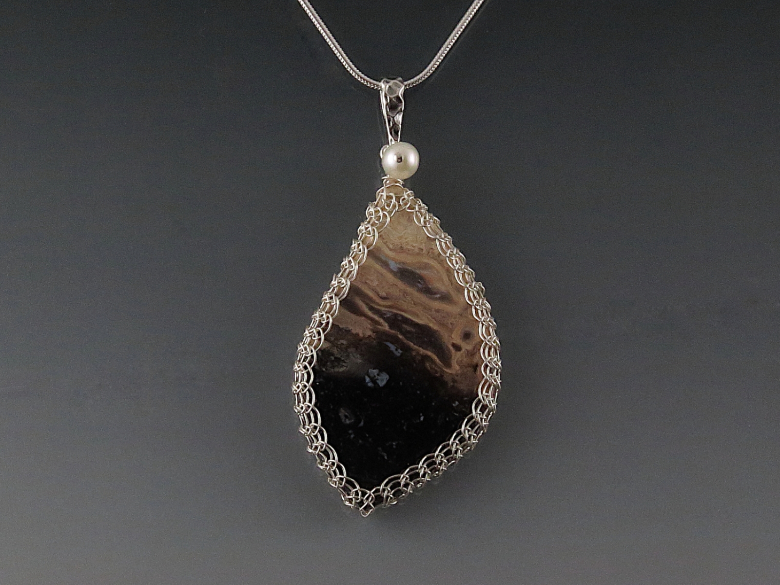 A beautiful petrified palm wood cabochon is captured in a viking knit weave crafted from sterling silver wire. I added a freshwater pearl accent bead and a sterling silver bail. The pendant measures 2 5/8 inches including the bail. It hangs from an 18 inch sterling silver snake chain.