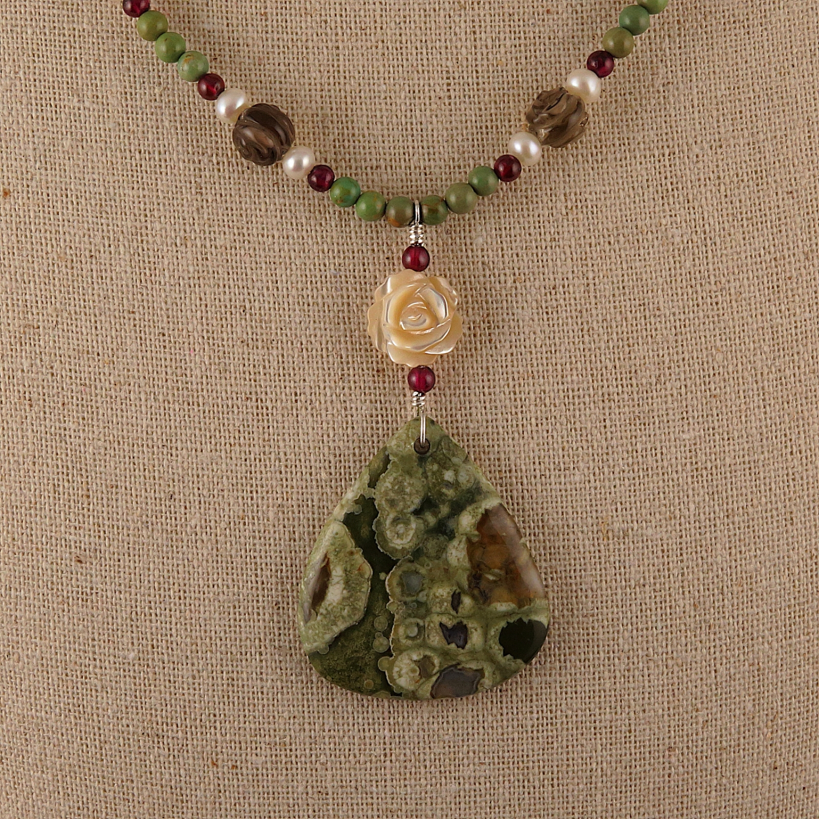 This beautiful necklace features a rainforest jasper teardrop focal paired with a carved mother of pearl rose and garnet accents. It is strung with carved smokey quartz roses, freshwater pearls, green turquoise and garnet. The necklace measures 18.5 inches and fastens with a Hill Tribe fine silver toggle clasp. The focal piece measures 2 3/8 inches.