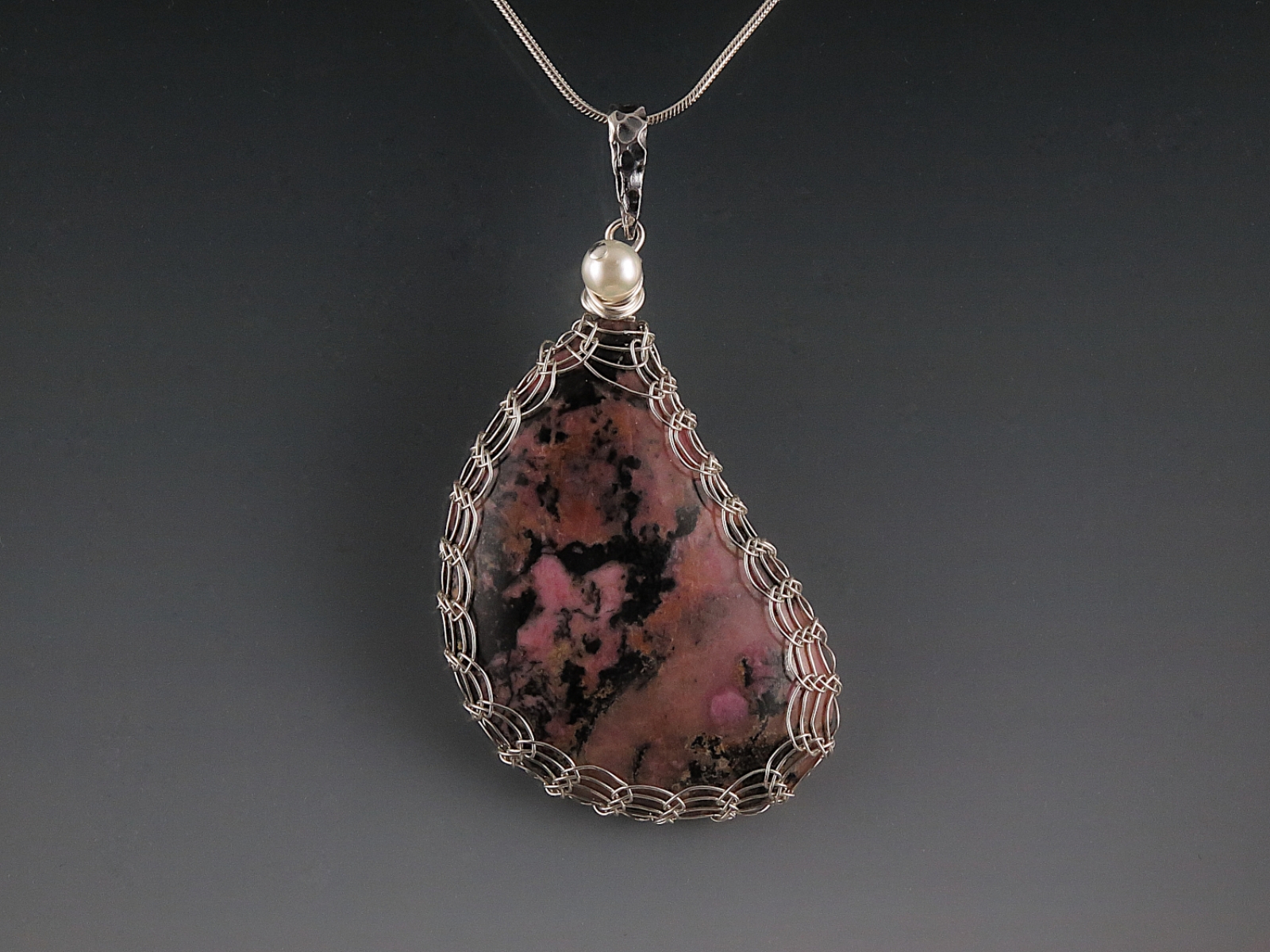 A beautiful rhodonite cabochon is captured in a viking knit weave crafted from sterling silver wire. I added a freshwater pearl accent bead and a sterling silver bail. The pendant measures 2 5/8 inches including the bail. It hangs from an 18 inch sterling silver snake chain.