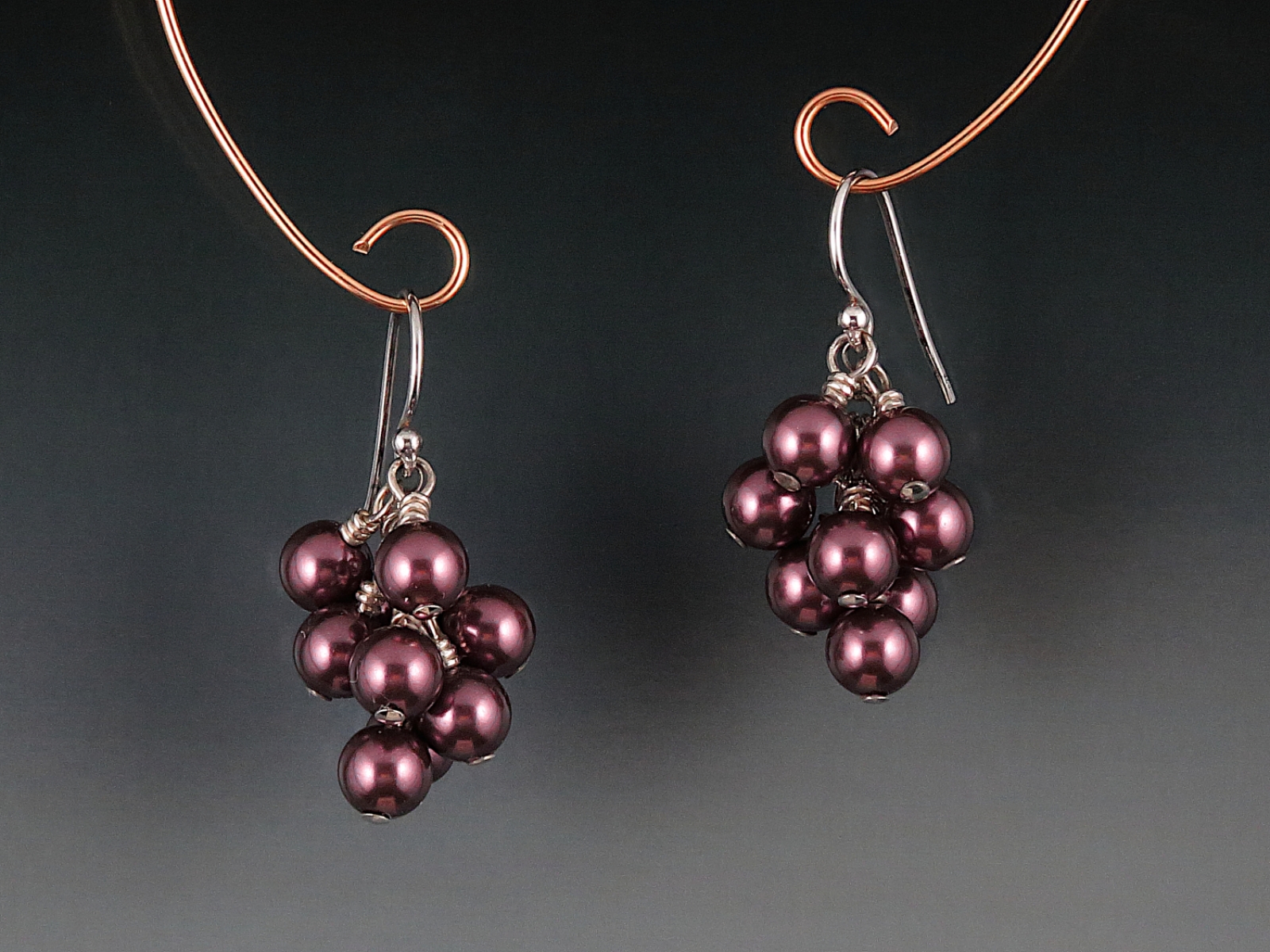 These delightful earrings are sure to become a favorite accessory. They feature clusters of 6mm Swarovski crystal pearls wire wrapped to tiny sterling silver chains. They hang 1 inch below the sterling ear wires.