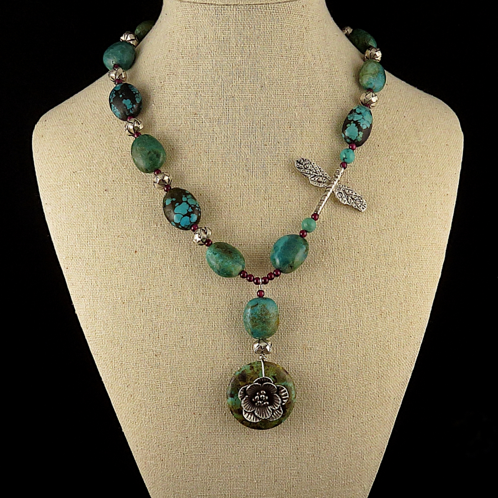 This beautiful necklace features genuine turquoise beads paired with vintage Karen Hill Tribe fine silver and garnet accents. It measures approximately 18 inches and fastens with a Bali Silver toggle clasp. The focal piece measures 2.5 inches.